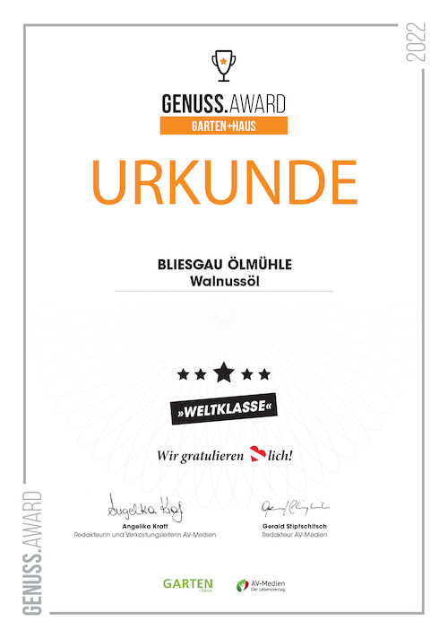 Die Zeitschrift „GARTEN+HAUS“* hat unserem Walnussöl das Prädikat „Weltklasse“ zuerkannt.