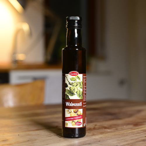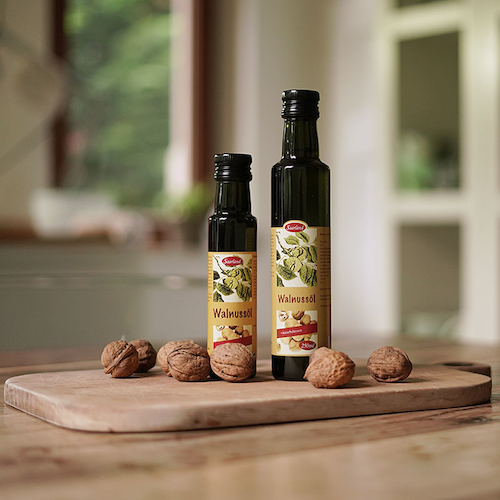 Naturbelassenes Bliesgau-Walnussöl eignet sich besonders gut für Salate und Gemüse oder für die Zubereitung von Süßspeisen mit kleinen Walnussstückchen.