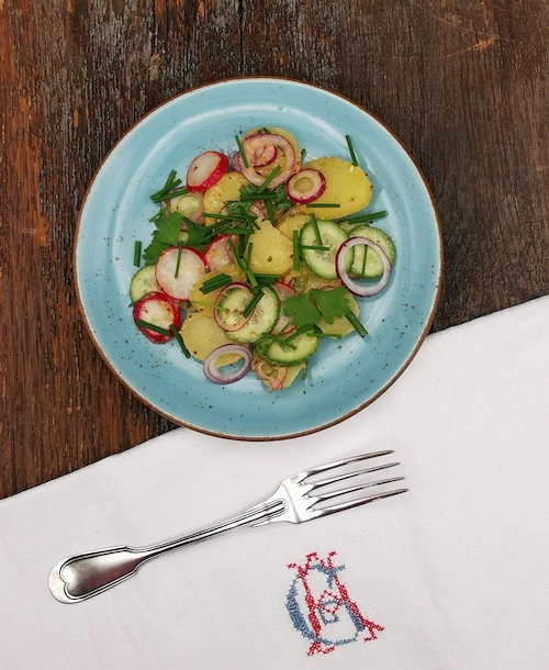 Kartoffeln kochen und anschließend in Scheiben schneiden. Zwiebeln, Salatgurke und Radieschen in feine Ringe schneiden. Schnittlauch und Petersilie fein hacken.