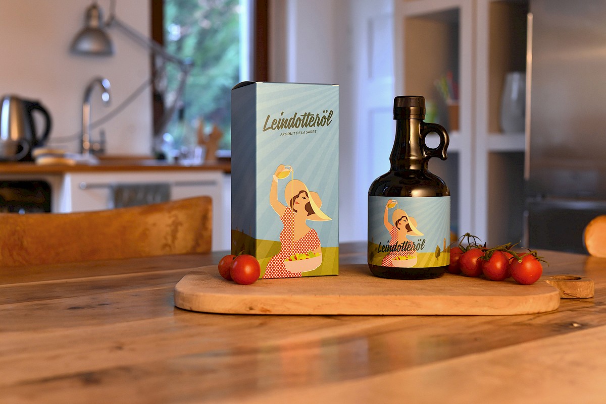 Aus diesem Grund haben wir edles Leindotteröl in eine formschöne 500 ml-Flasche abgefüllt und dieser einen attraktiven Karton spendiert. Art und Aufmachung sind ein Zitat an die „autonomen Jahre“ des Saarlandes zwischen 1947 und 1957, als der L’Etat Sarrois einen wirtschaftlichen Sonderweg ging und sich ästhetisch zwischen „typisch deutschen“ und „typisch französischen“ Geschmack bewegte. Ein wichtiger „Hotspot“ dieser Bewegung war die 1946 gegründete Schule für Kunst und Handwerk in Saarbrücken, die viele kreative Gebrauchsgrafiker hervorbrachte. Deren Design für heimische Produkte aller Art, traf den Geschmack ganzer Generationen und besitzt noch nach Jahrzehnten einen hohen Wiedererkennungswert, an den sich ältere Menschen gerne erinnern aber auch junge Leute begeistert.