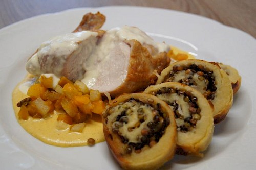 Jörg Bieg vom Restaurant Bellevue in 66440 Biesingen zeigt, was mit Linsen alles möglich ist. Diesmal als leckere Füllung für Roulade.