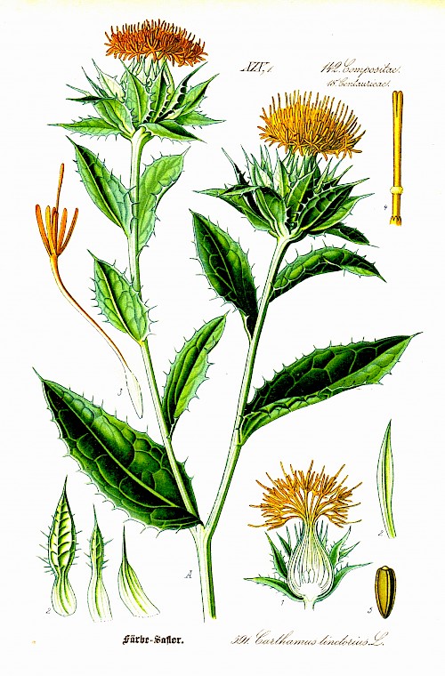 Vermutlich stammt die Färberdistel aus Kleinasien. Ihre Blüten wurden in Ägypten bereits 3500 v. Chr. zur Färbung von Mumienleinwänden und anderen Geweben verwendet. Diese enthalten das rot färbende Carthamin und den gelben Blütenfarbstoff Carthamidin. Davon rührt auch der Name Färberdistel her. Das gewonnene Samenöl nutzte man bereits in der Antike für Salben und als Lampenöl.