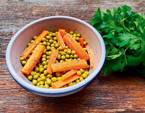 400 g Erbsen, 4 in Stifte geschnittene Karotten, 1 Prise Salz, 1 EL Mohnöl, 2 EL geröstete Mohnsamen.