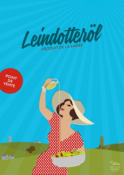 Aus diesem Grund haben wir edles Leindotteröl in eine formschöne 500 ml-Flasche abgefüllt und dieser einen attraktiven Karton spendiert. Art und Aufmachung sind ein Zitat an die „autonomen Jahre“ des Saarlandes zwischen 1947 und 1957, als der L’Etat Sarrois einen wirtschaftlichen Sonderweg ging und sich ästhetisch zwischen „typisch deutschen“ und „typisch französischen“ Geschmack bewegte. Ein wichtiger „Hotspot“ dieser Bewegung war die 1946 gegründete Schule für Kunst und Handwerk in Saarbrücken, die viele kreative Gebrauchsgrafiker hervorbrachte. Deren Design für heimische Produkte aller Art, traf den Geschmack ganzer Generationen und besitzt noch nach Jahrzehnten einen hohen Wiedererkennungswert, an den sich ältere Menschen gerne erinnern aber auch junge Leute begeistert.