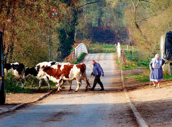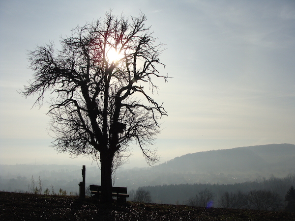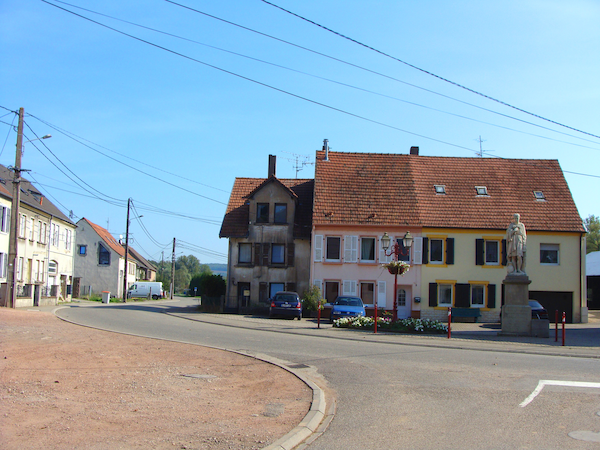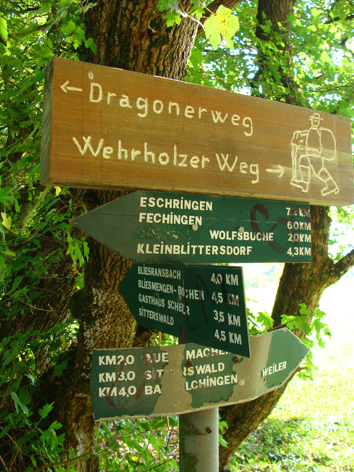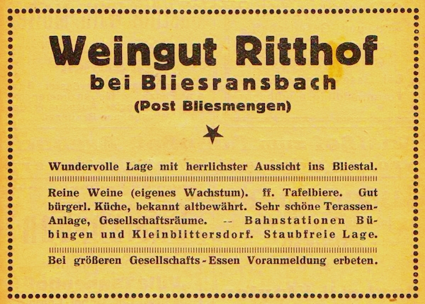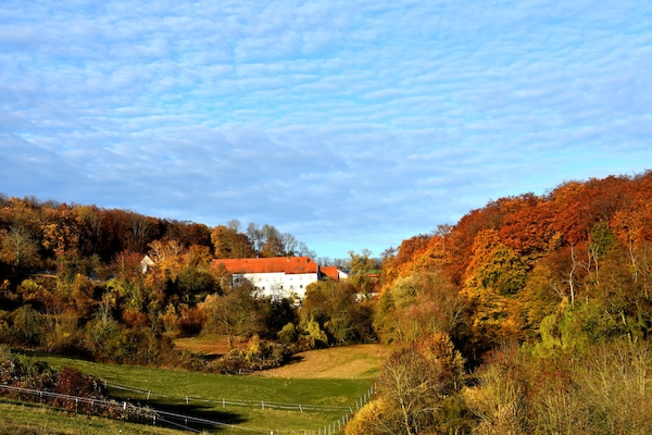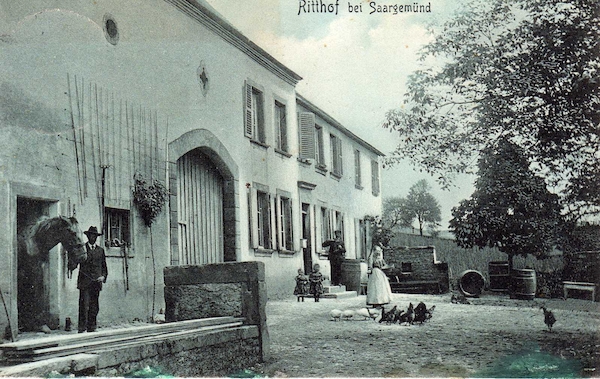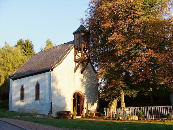 Wir beginnen auf dem Gut Hartungshof 1 wo sich auch Parkgelegenheiten befinden (bitte so abstellen, dass landwirtschaftliche Fahrzeuge noch durchkommen!). In einem der größeren Gebäude befindet sich die Bliesgau- Ölmühle (außerhalb der Geschäftszeiten bitte Besichtigungswunsch vorher anmelden). Von dort sind es 100 Meter bis zur Kreuzung, an der es rechts auf den „Ransbacher Berg“ geht. Hinter der Scheitellinie des Berges bleiben wir (links halten) auf dem Jakobsweg bzw. dem Dragonerweg und blicken rechts bis nach Saarbrücken. Es beginnt ein etwa 2 km langes Waldstück bis zur Landstraße. Wer möchte, kann noch einen Abstecher zum nahe gelegenen Wintringer Hof 2 mit seinem Landgasthaus und der Wintringer Kapelle unternehmen. Nach Überquerung der Landstraße zwischen Kleinblittersdorf und Bliesransbach erreichen wir den Parkplatz Kappelberg. Auf dem Weg, der bei Einheimischen auch „Wehrholzer Weg“ heißt, geht es etwa 2 km südlich durch den Wald. Wo der Baumbestand endet und freie Höhensicht möglich wird, halten wir uns links und erreichen nach 500 Metern, parallel unseres ursprünglichen Weges, ein Wegekreuz, an dem wir links von der Höhe talabwärts gehen. Im Tal an der Bliesgersweiler Mühle 3 angekommen, überqueren wir nach 200 Metern die Brücke nach Blies-Guersweiler. In dem lothringischen Dorf lassen wir die kleine Kirche rechts liegen und stehen vor dem Denkmal zu Ehren des Heiligen Quirins. Wir folgen nun dem Schwarzen Kreis entlang der Hauptstraße nach Blies-Schweyen. In der Nähe der noch heute Elektrizität erzeugenden „Blies-Guersweiler Wassermühle“ 4 wechseln wir auf die linke Straßenseite und folgen etwa 500 Meter dem Fußweg am Mühlengraben bis zur Fußgängerbrücke zwischen Blies-Schweyen und Bolchen. Wieder auf der deutschen Seite, am Ortsanfang von Bliesmengen-Bolchen, halten wir uns erneut links (Vorsicht: Dieses 600 Meter lange Teilstück verläuft entlang einer für Fußgänger unbefestigten Landstraße!), ziehen an der ehemaligen Uhrigsmühle vorbei, hinauf zum traditionsreichen Ritthof 5 , der einst ein beliebtes Wanderziel des Schriftstellers Alfred Döblin war. Ihm zu Ehren wurde dieser panoramareiche Feldwirtschaftsweg „Alfred-Döblin-Weg“ benannt. Sieben Infotafeln informieren über Leben und Werk des Autors. An der Wendelinuskapelle 6 angekommen, biegen wir rechts ab und folgen nach weiteren 100 Metern links dem Anstieg. Nach 600 Metern auf die Höhe ist der kreuzende Jakobsweg erreicht. Wer etwas außer Puste gekommen ist, kann sich hier linkerhand auf einer der aufgestellten Bänke ausruhen. Genießen Sie hier bei klarem Wetter Fernblicke bis zum Donon in den Nordvogesen oder den Bergkegeln bei Toul in östlicher Richtung. Nach ca. 1 km haben Sie den Ausgang der Wanderung auf dem Gut Hartungshof erreicht.