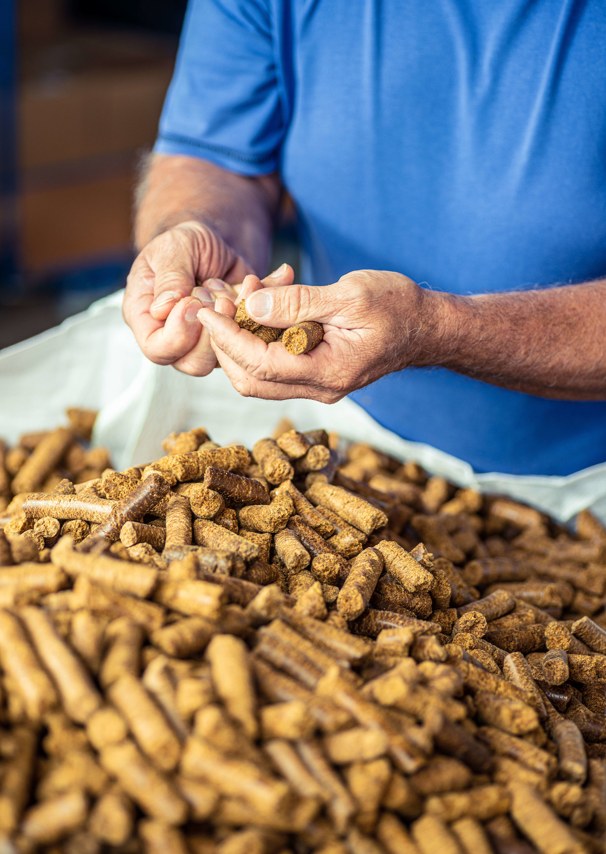 Unsere Ölmühle ist nicht nur Hersteller von genussreichen Speiseölen. Bei der Ölpressung fällt auch „Ölkuchen“ bzw. „Presskuchen“, bestehend aus den Schalen und den Zellwänden in Form von Pellets an.