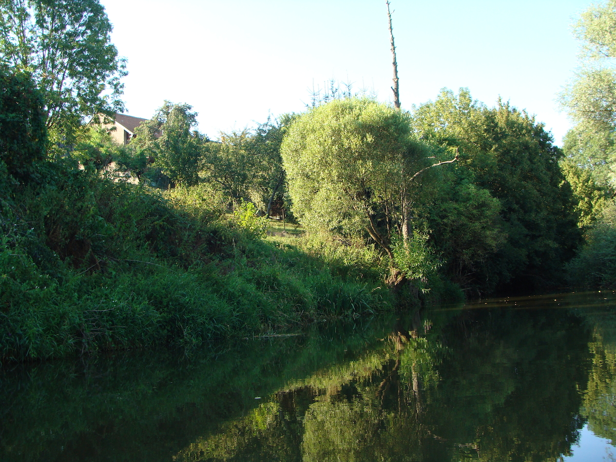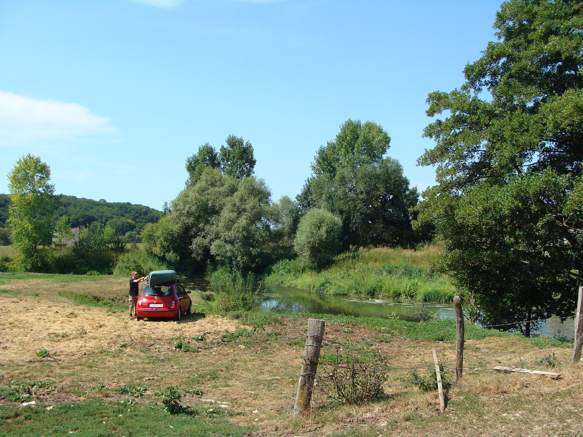 Unweit von der „Sarraltroff-Mühle“ in der Rue de la Sarre konnten wir unser Kanu (auf der ersten Etappe waren wir zu zweit) bequem zu Wasser lassen. „Bequem“, weil ein Landwirt freundlicherweise keine Kühe hat auf der Weide stehen und wir problemlos bis ans Ufer fuhren.