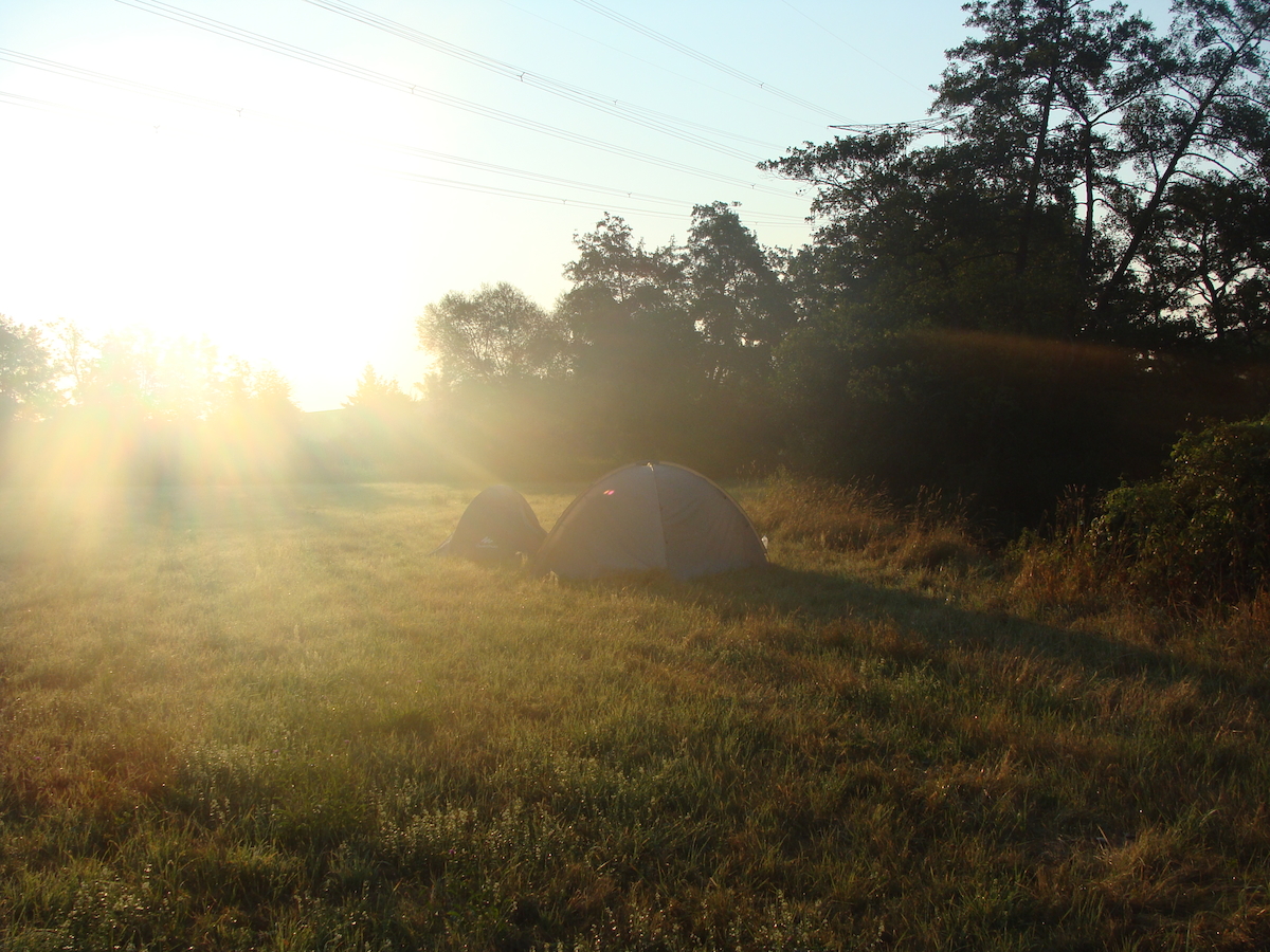 Von den Strapazen des Kanutransports bei Géroldseck und der großen Hitze beschlossen wir schon auf halber Strecke zwischen Diedendorf und Bischtroff-sur- Sarre unser Lager aufzuschlagen. Wer weiß, ob wir weiter flussabwärts einen so passenden Übernachtungsort finden?