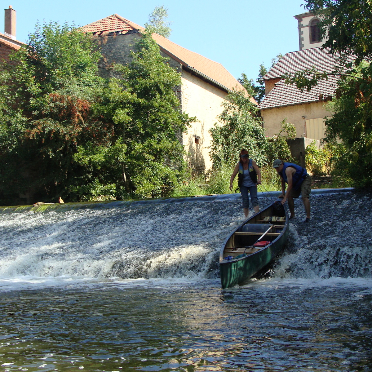 Das Wehr bei Bischtroff wird überwunden. Links sind die Gebäude der alten Getreidemühle zu erkennen.