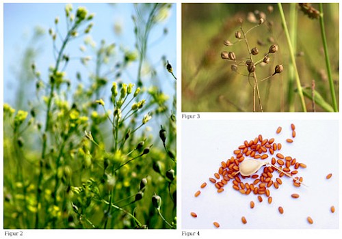 Der Leindotter ist eine einjährige, krautige Pflanze, die eine Höhe von maximal 80 Zentimetern erreicht. Auf seinem aufrechten Stängel trägt er kleine gelbe oder weiße Blüten, die birnenförmige oder Früchte in Form eines umgedrehten Eis [obovoid] hervorbringen, die Schötchen genannt werden (Figur 2, 3). Letztere enthalten etwa 15 kleine längliche Samen, deren Farbe von Goldgelb (daher auch sein Name im Englischen gold of pleasure) bis rötlich Braun variiert (Figur 4). Eine stark vorspringende Keimwurzel und eine Epidermis, die von kleinen, stumpfen Papillen überzogen ist, kennzeichnen die Samen und helfen bei der Erkennung der Gattung Camelina. Zur Bestimmung der Art oder Unterart müssen jedoch morphometrische Kriterien miteinbezogen werden, da sich die Morphologie der Samen der verschiedenen Taxa sehr ähnlich ist.