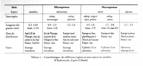 Tabelle 1 enthält ebenfalls Angaben bezüglich der Verbreitung jedes Taxons und ihres ökologischen Status. Die Art rumelica, die im Südosten Frankreichs vorkommt, ist ebenfalls in der Tabelle verzeichnet. Damit steht ein Schlüssel zur Identifizierung der Samenkornlänge zur Verfügung. Durch ihn sollte die Kulturpflanze (sativa) von den Wildpflanzen (rumelica, microcarpa) oder den Adventivpflanzen anthropogener Herkunft (alyssum) unterschieden werden können.