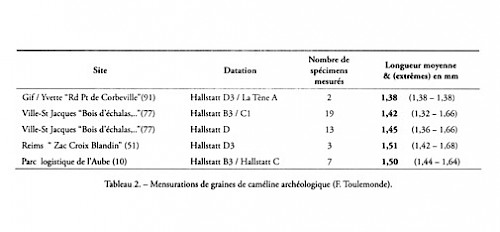Verkohlte, archäologische Fundstücke von Leindottersamen, die in mehreren nördlichen Ausgrabungsstätten gefunden wurden², wurden mit Hilfe eines auf eine binokulare Lupe montierten Mikrometers gemessen. Es wurden nur ganze Exemplare berücksichtigt, bei denen die Epidermis noch vorhanden war. Die Überprüfung dieser verschiedenen Messungen (Tabelle 2) und ihr Vergleich mit dem Identifizierungsschlüssel (Tabelle 1) lassen es nicht wirklich zu, zwischen microcarpa und sativa zu unterscheiden (rumelica wurde nicht berücksichtigt, weil sie in Nordfrankreich nicht vorkommt). Die Zahlen scheinen sich mehr im unteren Bereich der Bandbreite von sativa zu bewegen, aber die Ungewissheit rührt daher, dass man nicht weiß, welchen genauen Effekt die Verkohlung ["carbonisation"] auf die Länge der Samenkörner des Leindotters hatte.