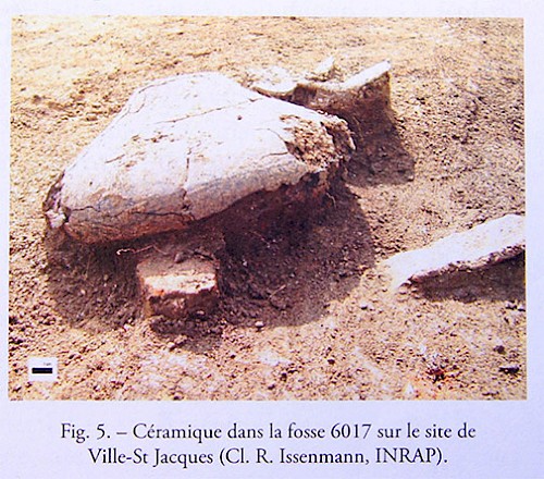 Der Graben 6017 hat eine ovale Form, eine Länge von 2,50m, eine Breite von 2,25m und eine Tiefe von 0,55m. Sein Inhalt besteht aus Detritus, genau wie der zeitgenössischer Ausgrabungsabschnitte. Er enthält stark aschige und geschwärzte Ablagerungen, Fauna [tierische Reste], gerötete Erde, eine große Anzahl Keramikscherben sowie ein ganzes Gefäß, das umgedreht und mit seiner Oberseite [Öffnung] auf der Erdschicht liegt (Figur 5).