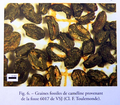 Eine Zerkleinerung der Samenkörner ist für die Ölgewinnung in der Tat notwendig, um das ölhaltige Mark [Pulpa] aus der Samenhülse zu schälen, egal ob das Öl durch Kaltpressen oder durch Extraktion gewonnen wird. Außer zur Ölgewinnung dient die Zerkleinerung der Samenkörner auch dazu, sie zu Pulver zu zermahlen, um sie als Würzmittel zu gebrauchen. Dieser Vorgang, den wir an einem experimentellen Mühlstein testen konnten, lässt sich ohne weiteres realisieren und produziert ähnliche Fragmente wie die, die in Ville-St-Jacques gefunden wurden. Auch wenn man auf Grund dieser Tests noch keine definitiven Schlussfolgerungen ziehen kann, so zeigen sie dennoch, dass Interpretationen im Zusammenhang mit der Nutzung des Leindotters plausibel sind, zumal die Pflanze auch noch für Hallstatt D an diesem Ort zu finden war, zwar in geringerer Menge, aber dafür auf regemäßige Weise.